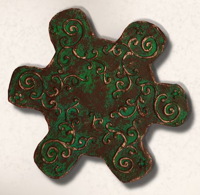 Made of materials rescued from the garbage such as old paint clothes, packing Styrofoam & previously used paper reinforced & sealed with nontoxic glue & paints 8" diameter