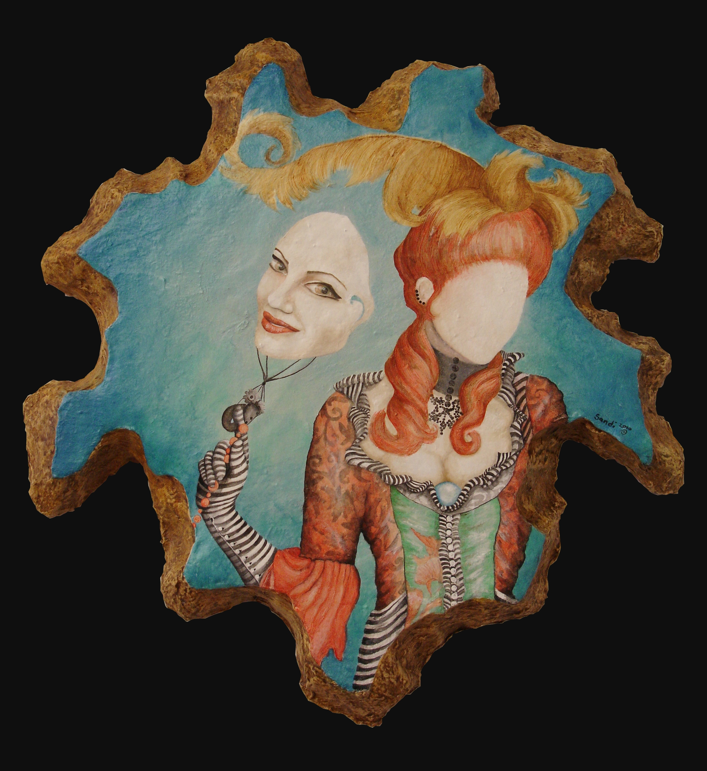 Made of materials rescued from the garbage as old paint clothes, packing Styrofoam & previously used paper reinforced & sealed with nontoxic glue & paints est 1.5' X 1.5'